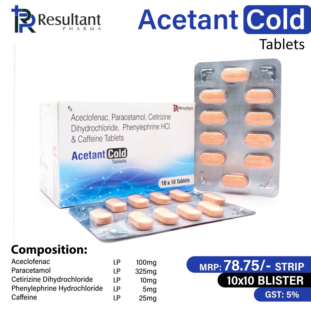 Aceclofenac I.P. 100mg + Paracetamol I.P. 325mg + Cetirizine Dihydrochloride I.P. 10mg + Phenylephrine Hydrochloride I.P. 5mg + Caffeine I.P. 25mg